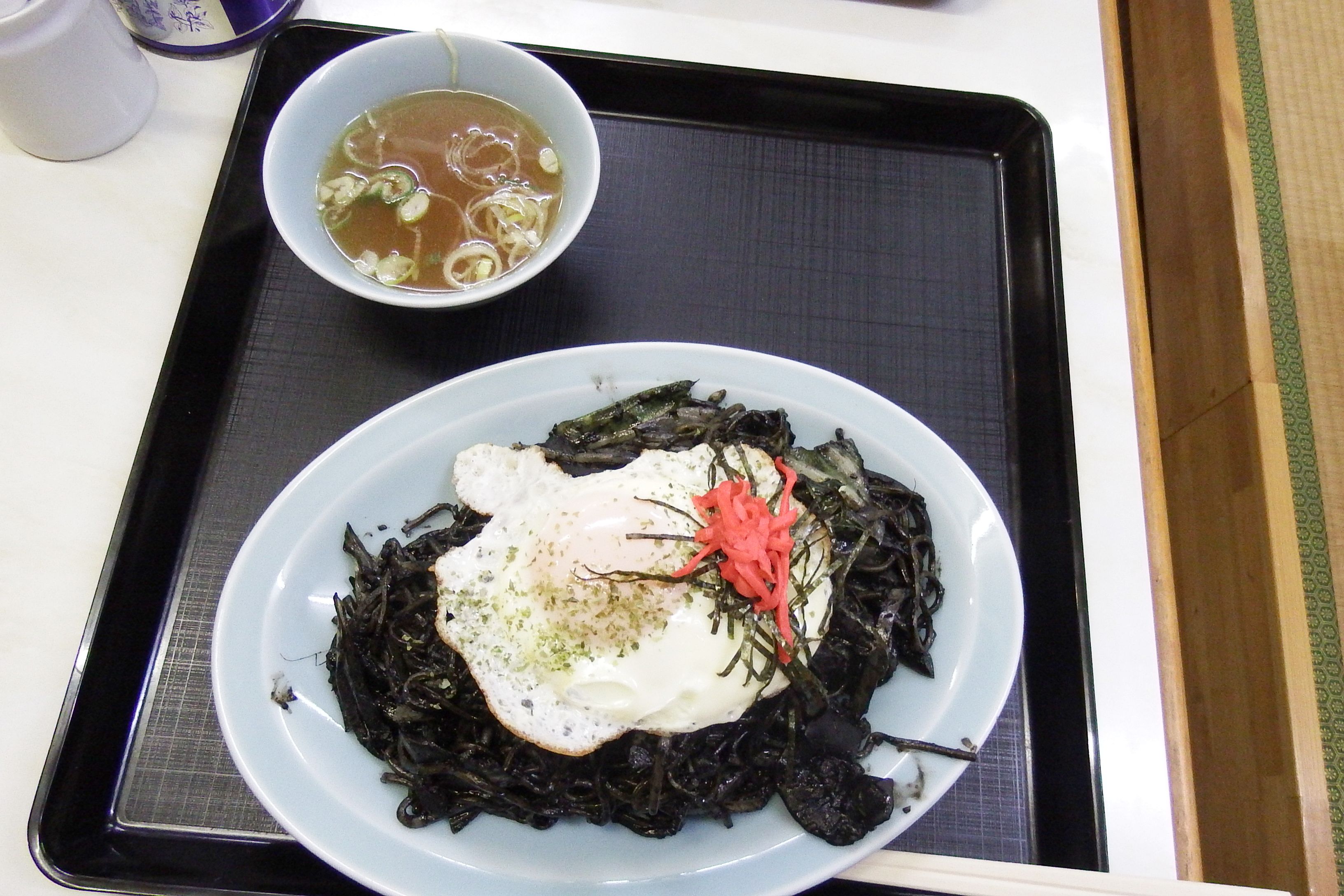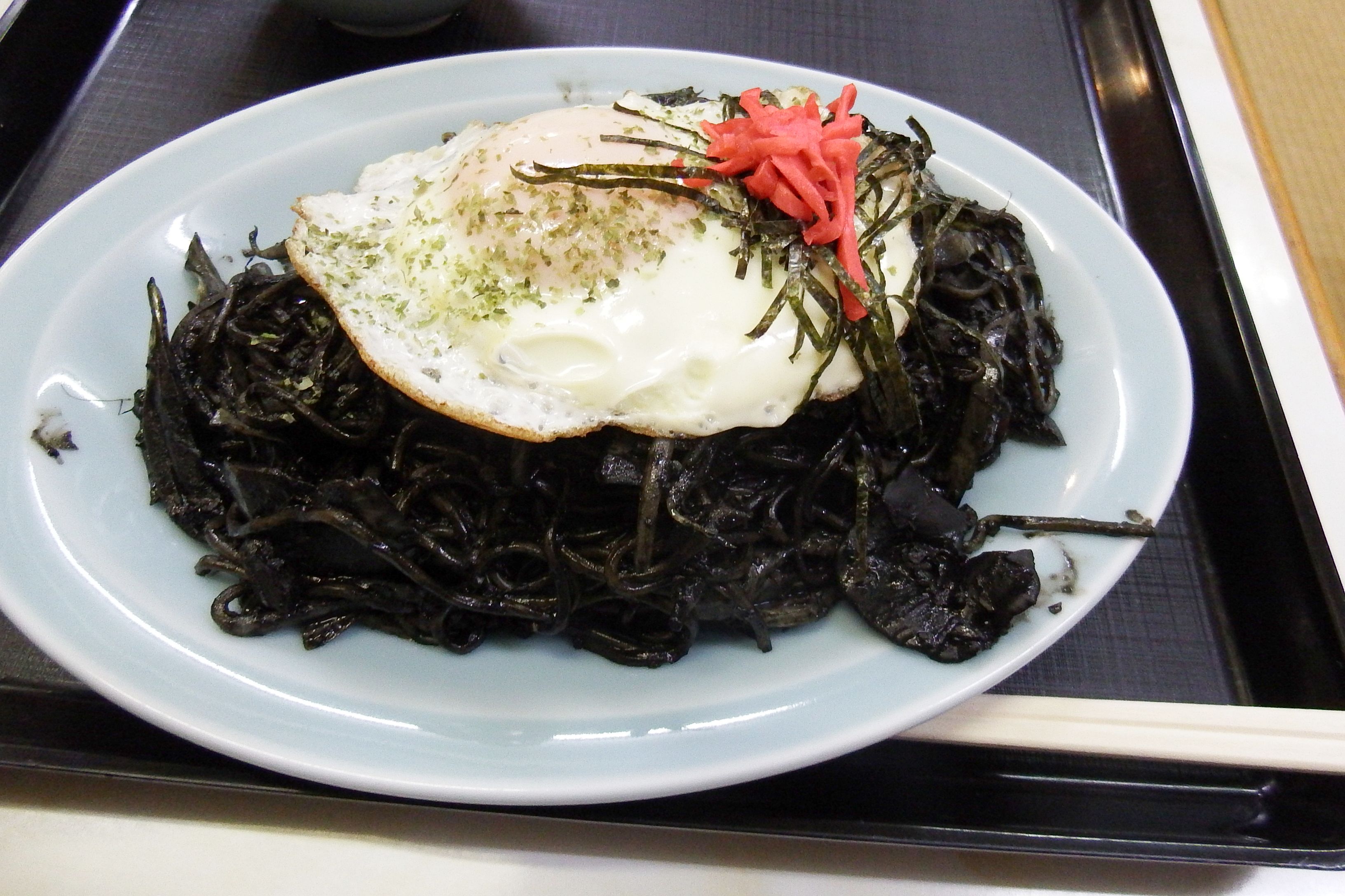 イカ墨で味付けしたやきそばに目玉焼きが載る。