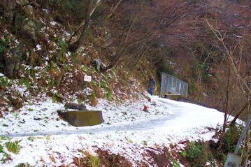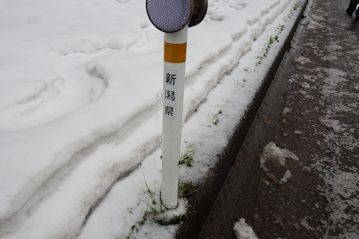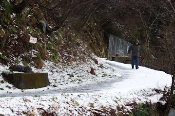 歩道は雪で埋まり,車道を歩いているのだが,勾配があって歩きにくい。 |