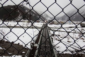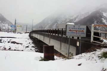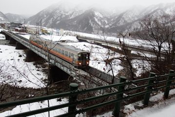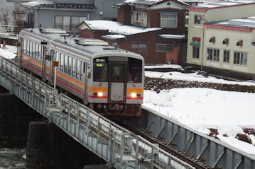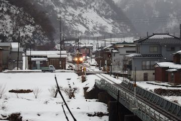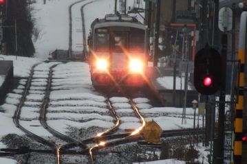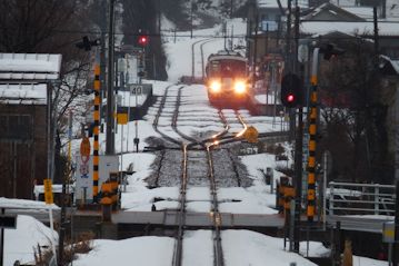 真っ白な景色で,さらに少し暗い中,このような電車の温色ライトはホッとさせてくれる。 |