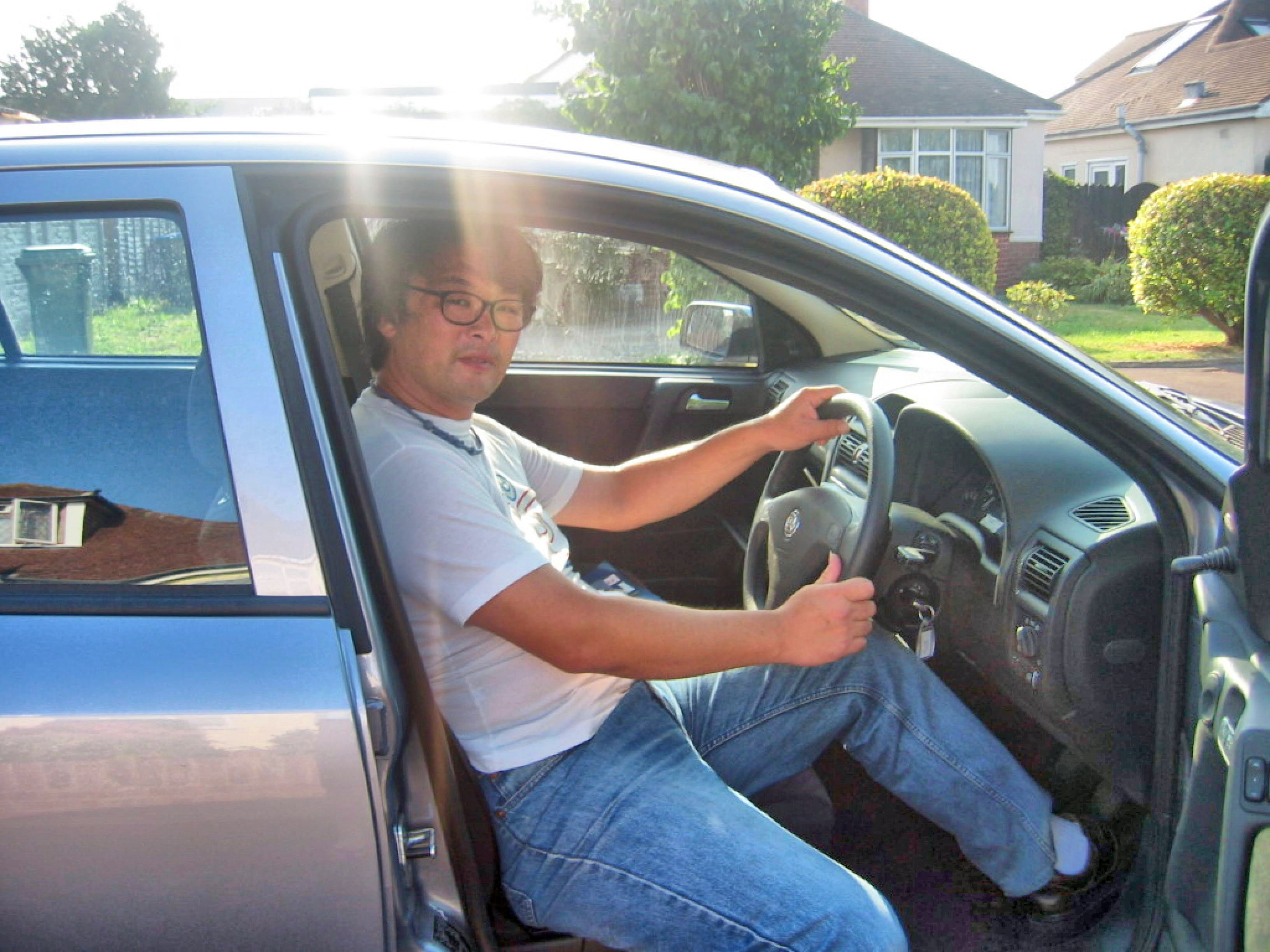 友人宅前でプジョーの運転席に得意げに座っている私。逆光がかっこいいと思いきや写したのはつっくんで、「まぶしいからはやく終わりにしたかった。」という本音が隠れていた。よく見ると私にとってはこの車も狭いということになるが予算の都合上しかたがないだろう。