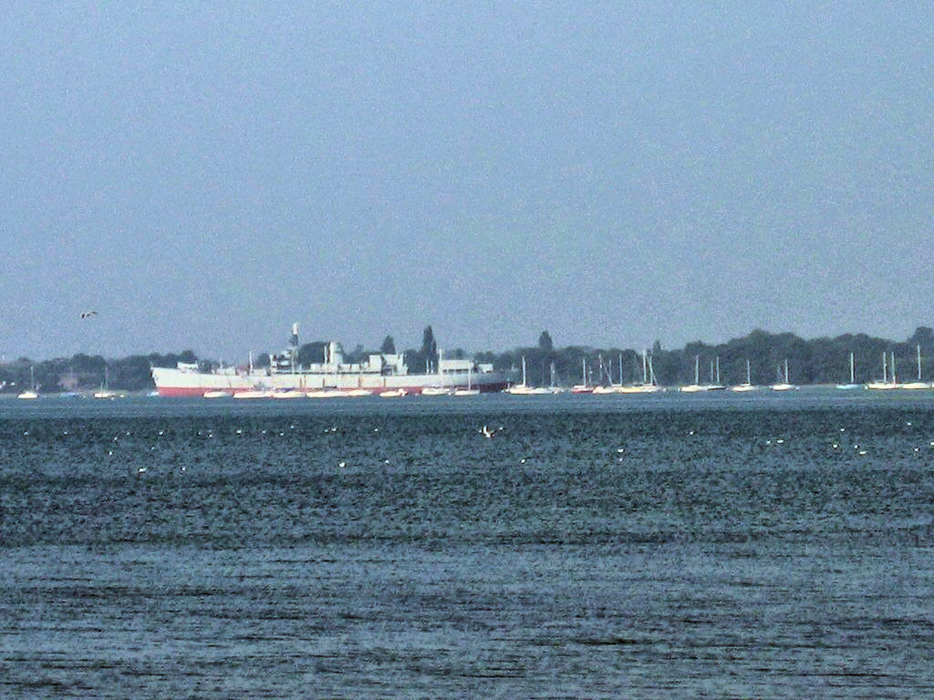 ポーチェスター城周囲の海(湾)を左の方から見ていこう。城の脇を通り海に出ると左手に大きな大きな丘が見えるが、ドーヴァー海峡近くにある名所「ホワイトクリフ」と勘違いしてしまった。写真では分かりづらいと思うが、崖の部分が本当に真っ白なのである。ガスっていたことを差し引くともっとはっきりした白なのだと思う。 |