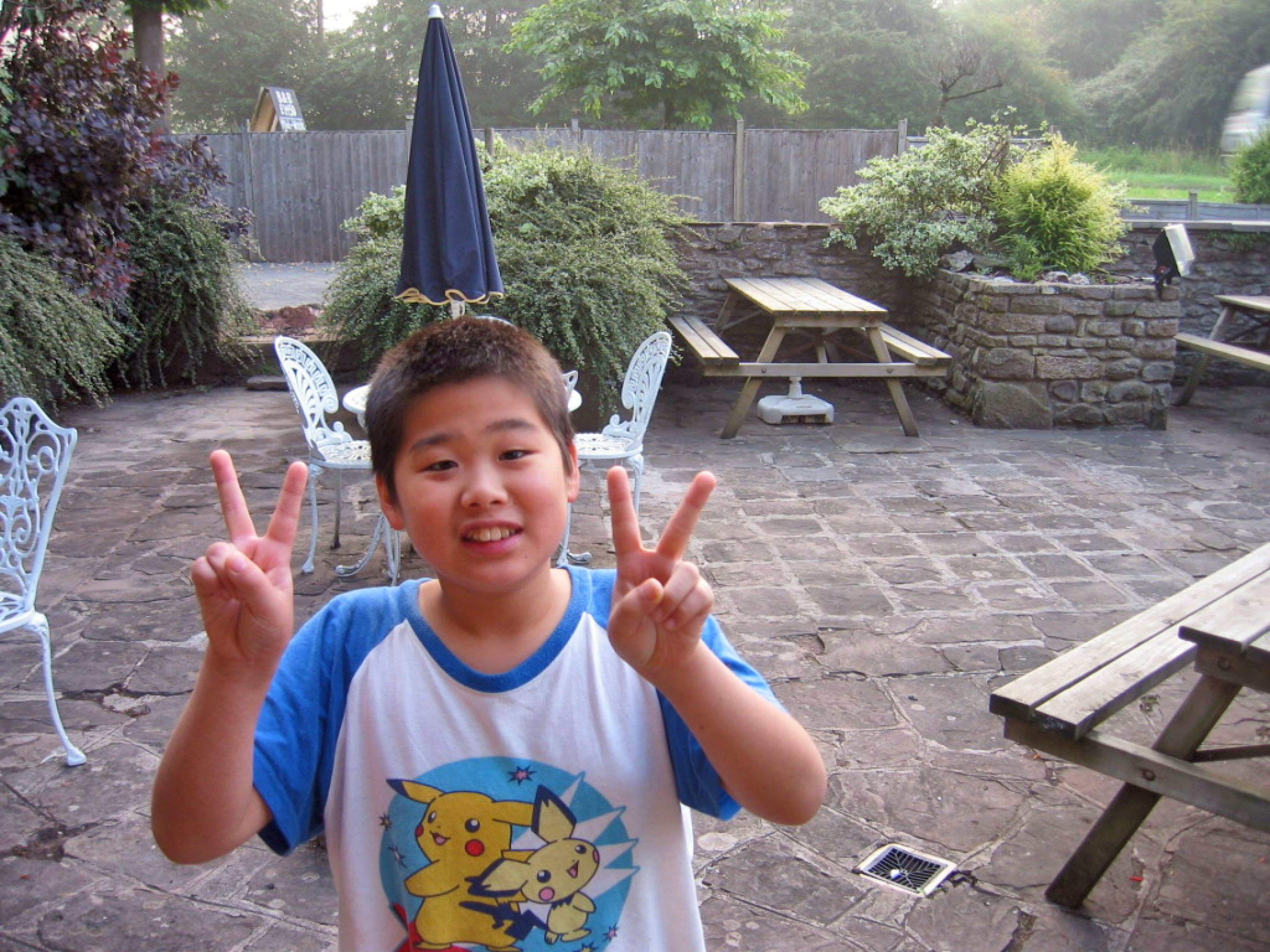 | 散歩も終盤にさしかかったらつっくんが起きてきた。写真ではピースをしているが、目はまだ覚めていないのである。 つまり「ここはどこ?、私は誰」状態だったのである。 |