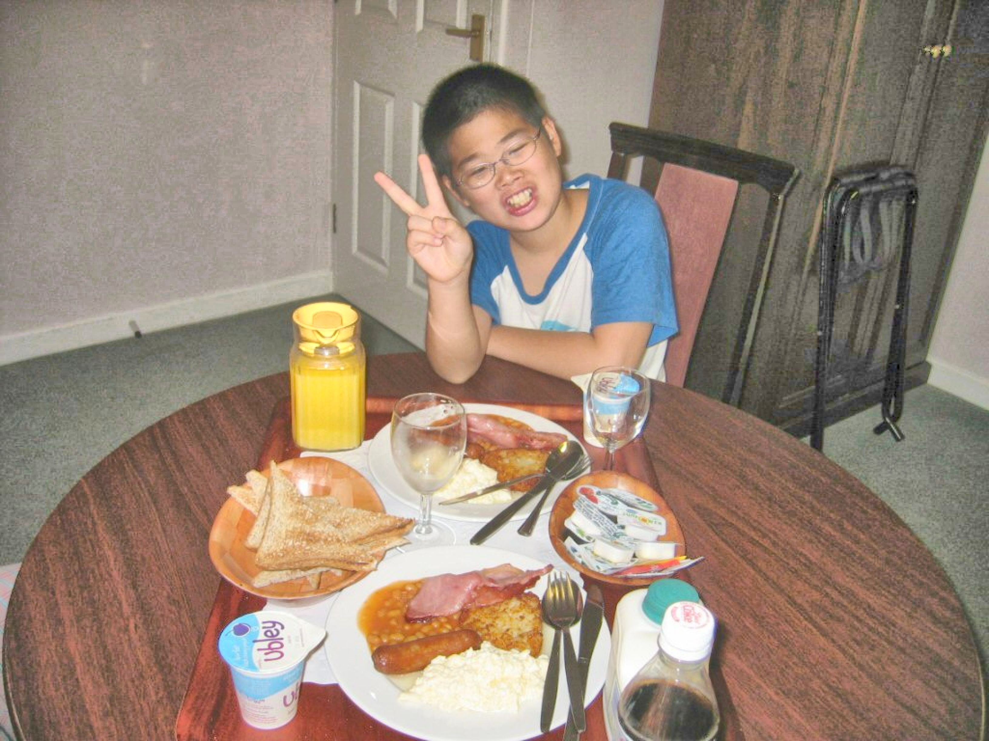 | そして多分無料のオレンジジュースとミルク。皿はソーセージ、ベーコン、フライドポテト、ベイクト・ビーンズに卵(スクランブル・エッグ)である。パンディの皿はベイクト・ビーンズではなくフライドブレッドがのっていた。卵の調理法も違うが、大方同様である。パンディほどではないが、ここでも満腹になったのである。肉類はすこぶる旨いと思った。 |