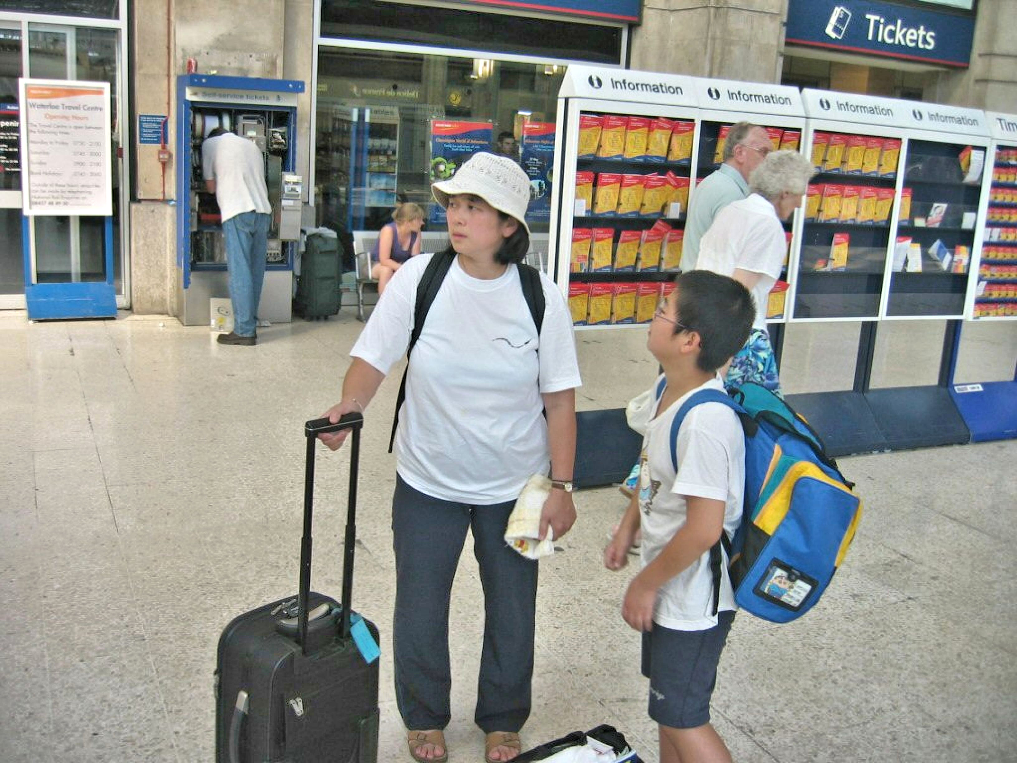 ウォータールーに着いた。この駅は涼しそうな名前なのだが、やはり暑かった。駅構内の時計と表示板を記念にと撮影してみたら、このように写った。もちろん逆光ではあるがそれだけではないのだ。熱気が渦を巻いているのである。ここでの気温は37℃、いやはや参った。 |