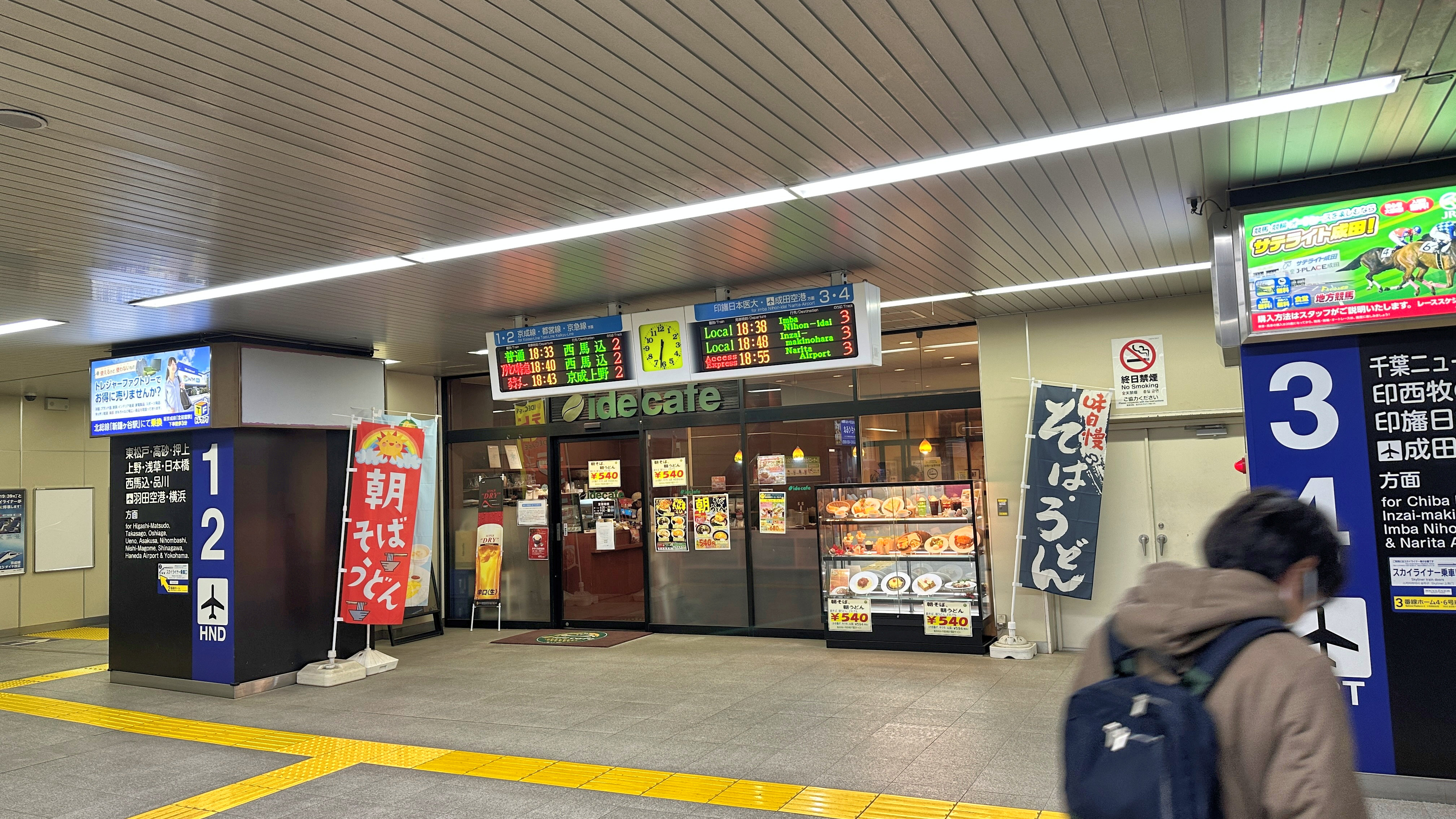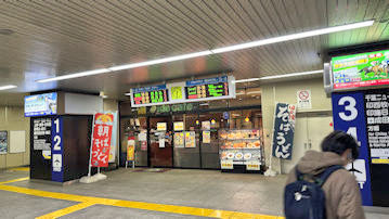 30分待ちなのでホームでは寒い。ここで時間を過ごす。売店の「そば・うどん」の幟が目に刺激的である。 |