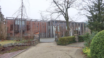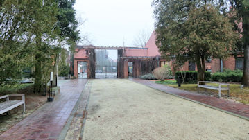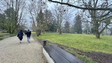 進行方向左手に見えるガラス張りの建物はカフェのようだ。まあ、今日は12月28日なので休業中ね。