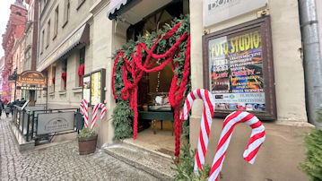 「オールドミル・ピエロガルニア」というポーランド料理の店。聖霊教会にぶつかって、右折してすぐ。