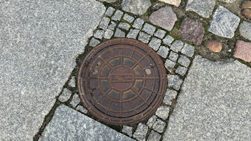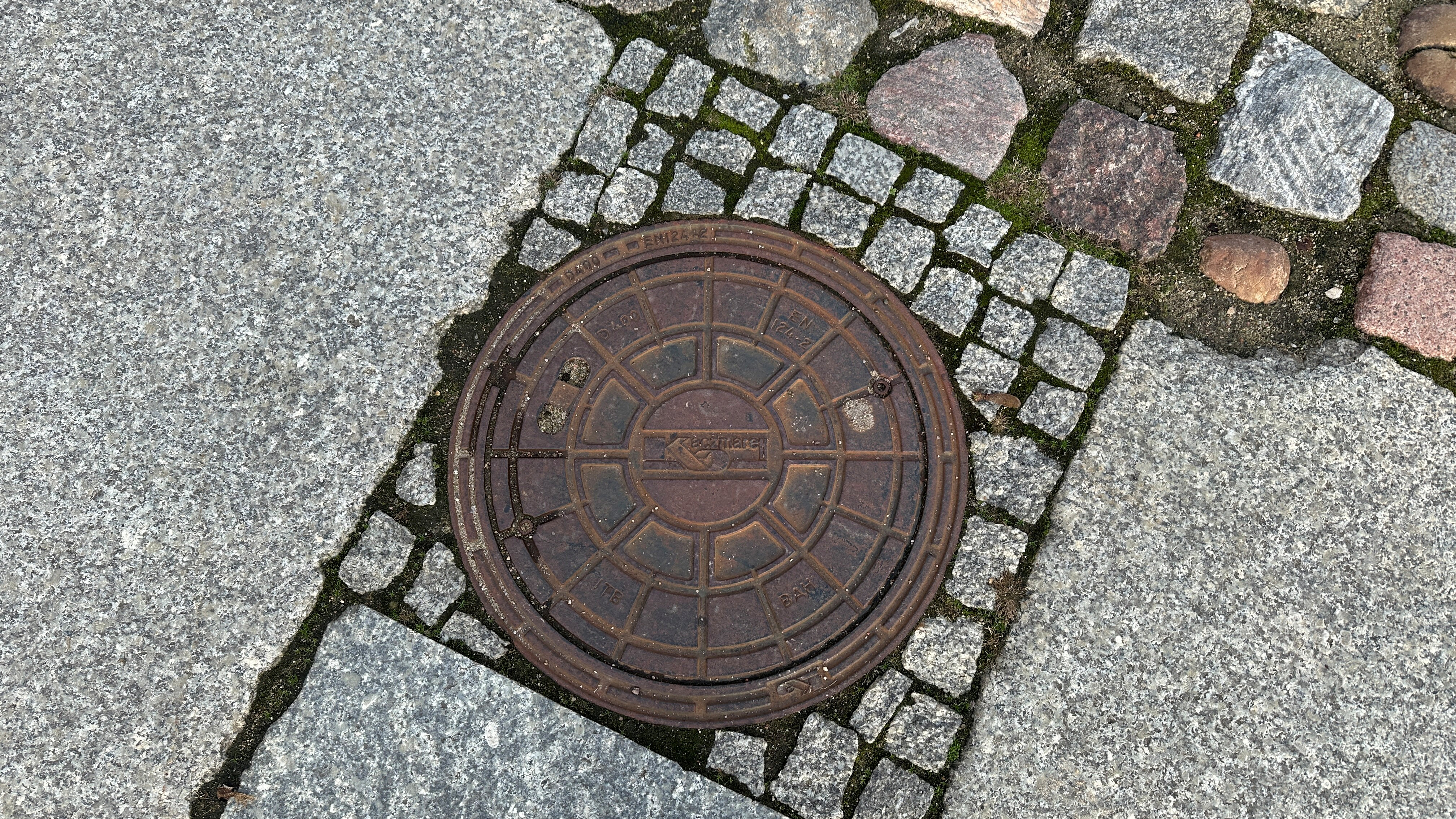 | マンホールの蓋の周囲が、小さな御影石で固定されている。コンクリートで固めてはなく、とてもお洒落な感じがする。 |