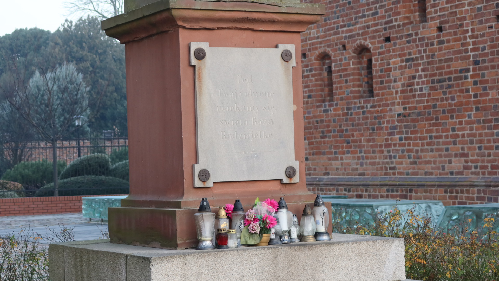 マリア様の塔の下には飲み物の入れ物がならんでいる。オーストリアのように空き瓶、空き缶でなければいいな。