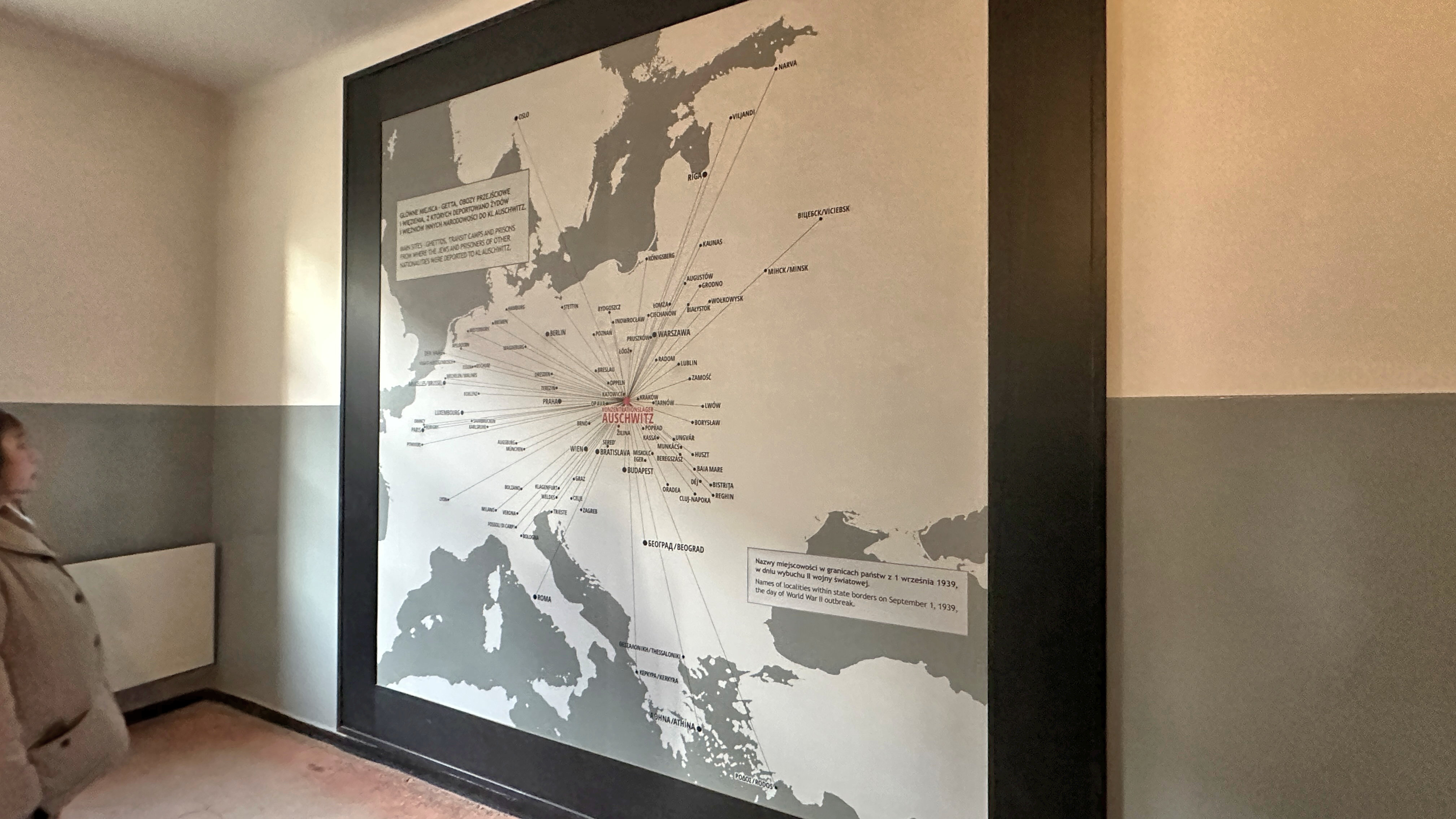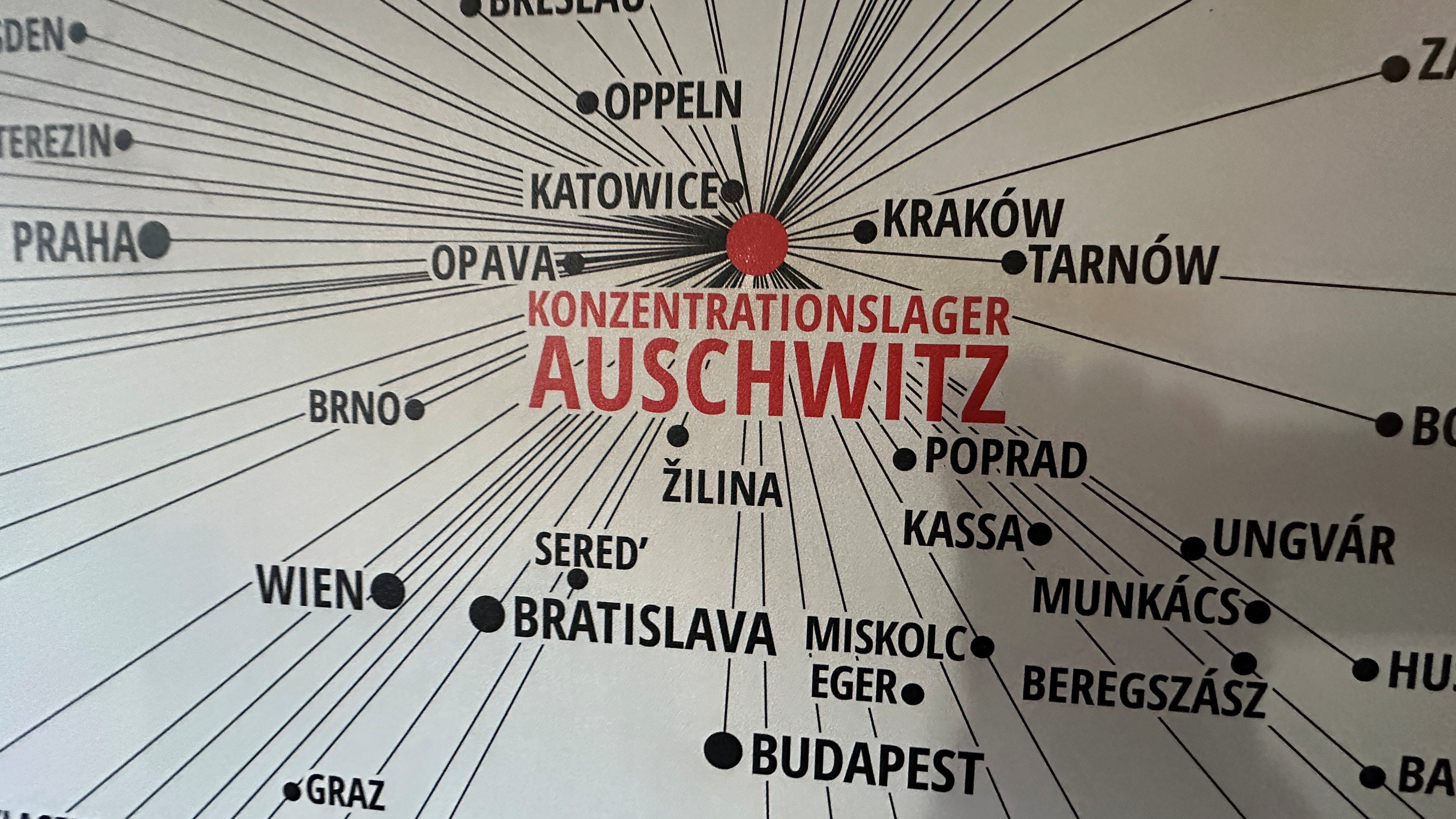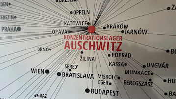 この地図は、第二次世界大戦中、ナチス・ドイツが占領下のヨーロッパ全土から人々をアウシュヴィッツ(ドイツ語名)へ移送した経路を示している。 |