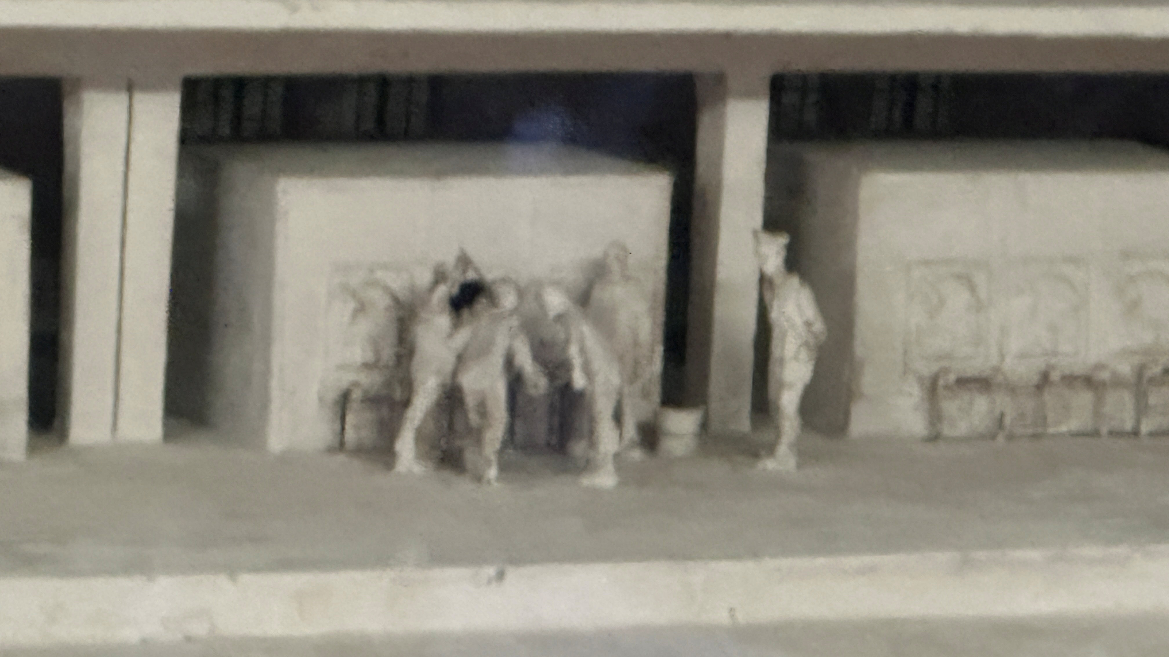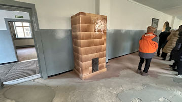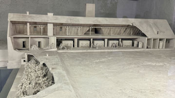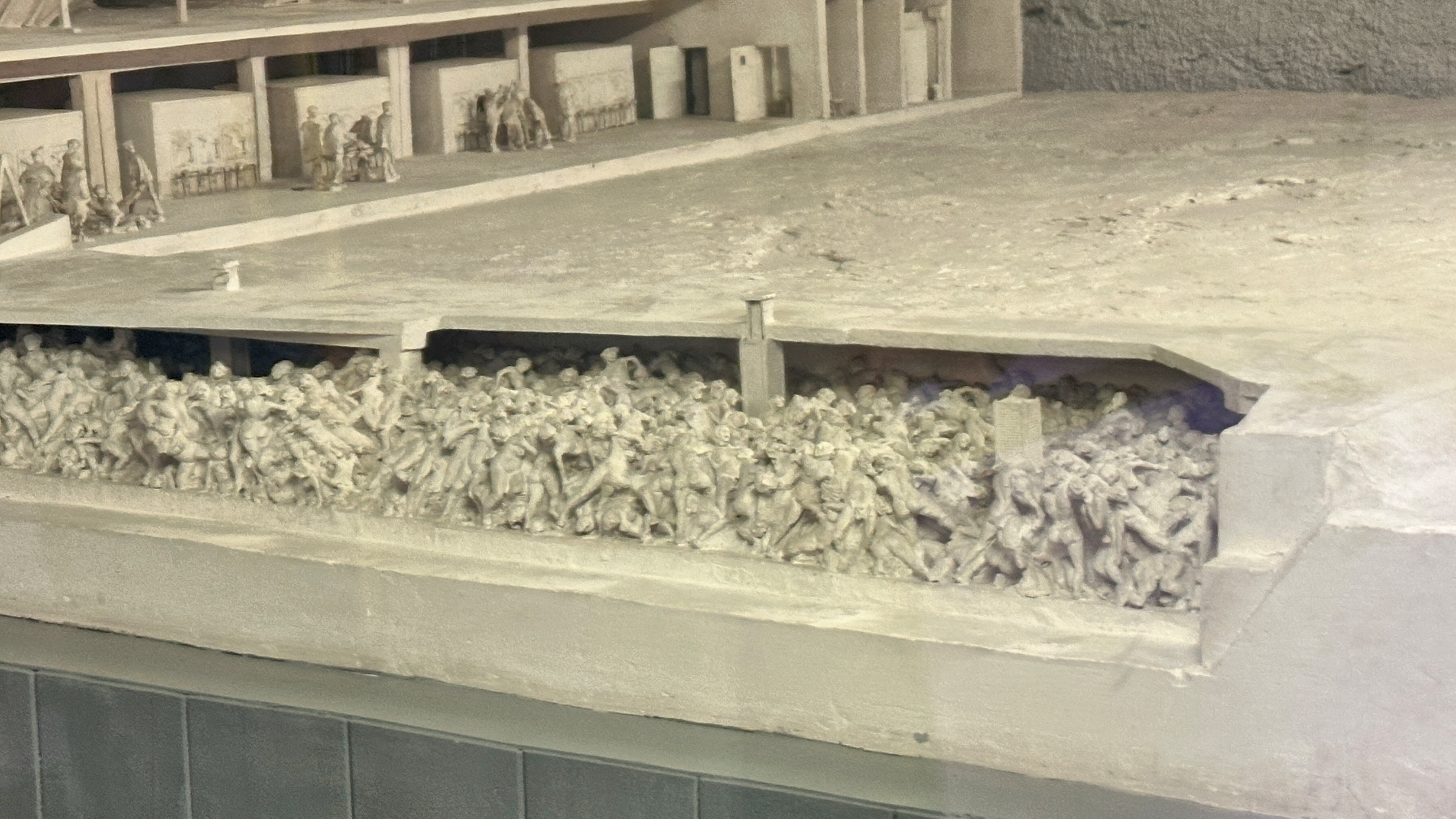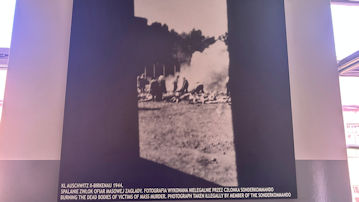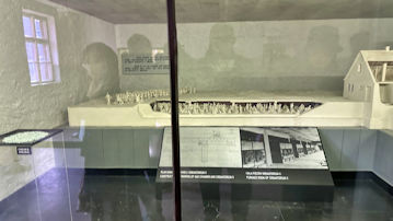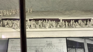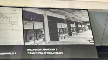 | 大量虐殺の様子の模型と、犠牲者を火葬する、火葬場IIの炉室の写真。 |