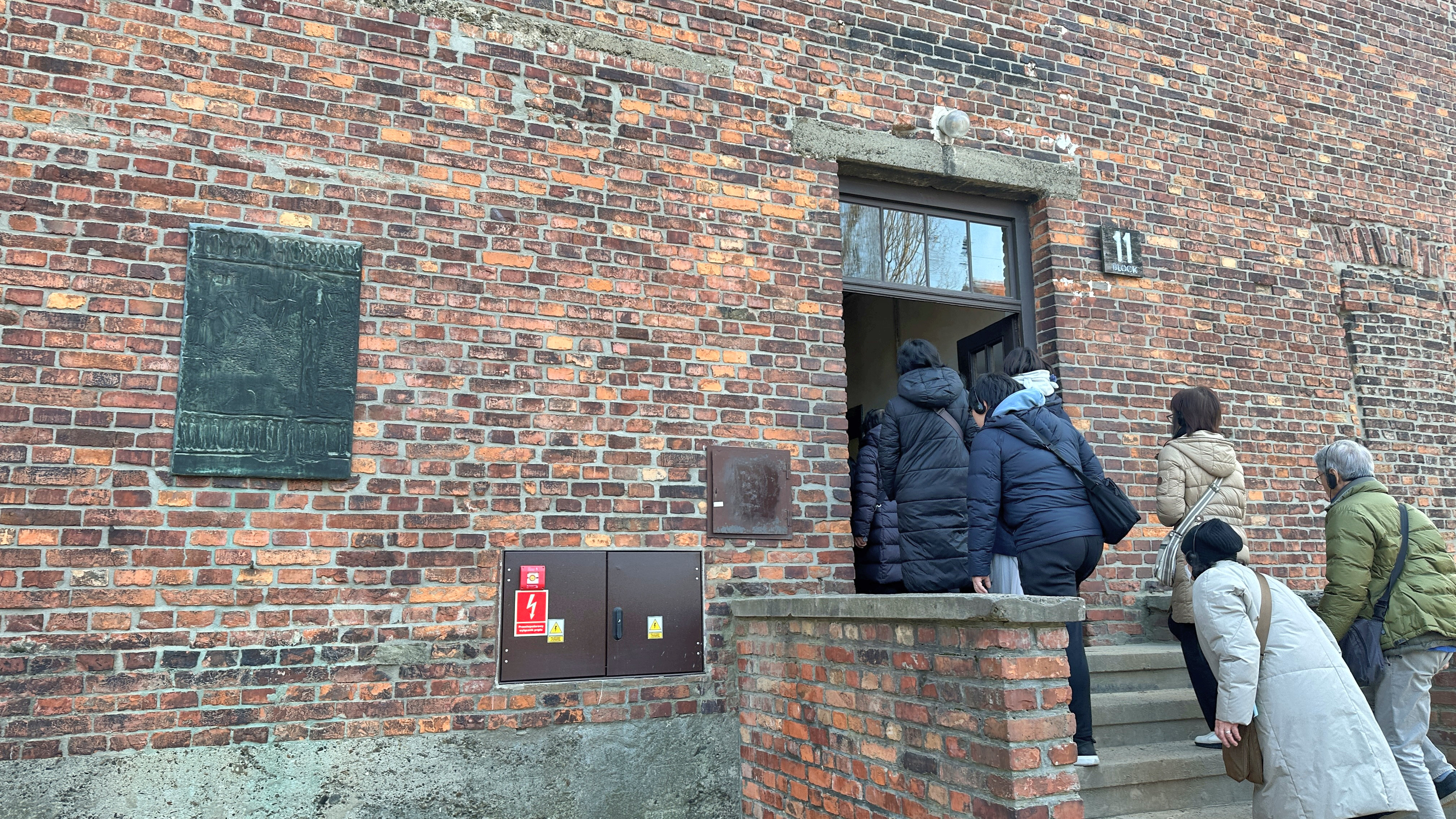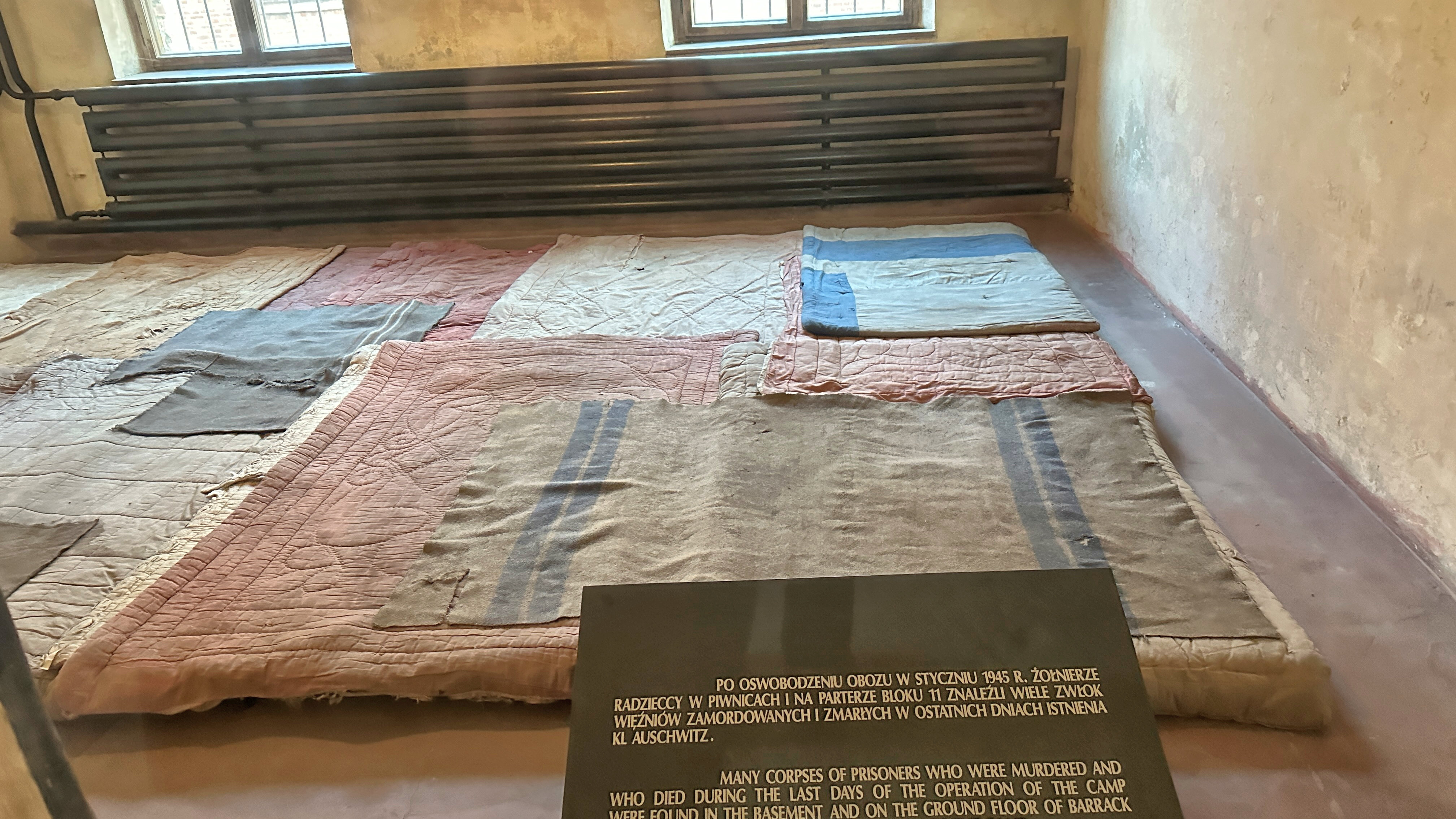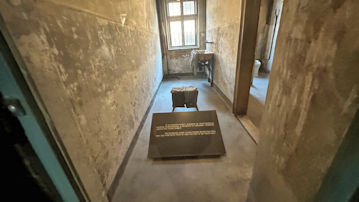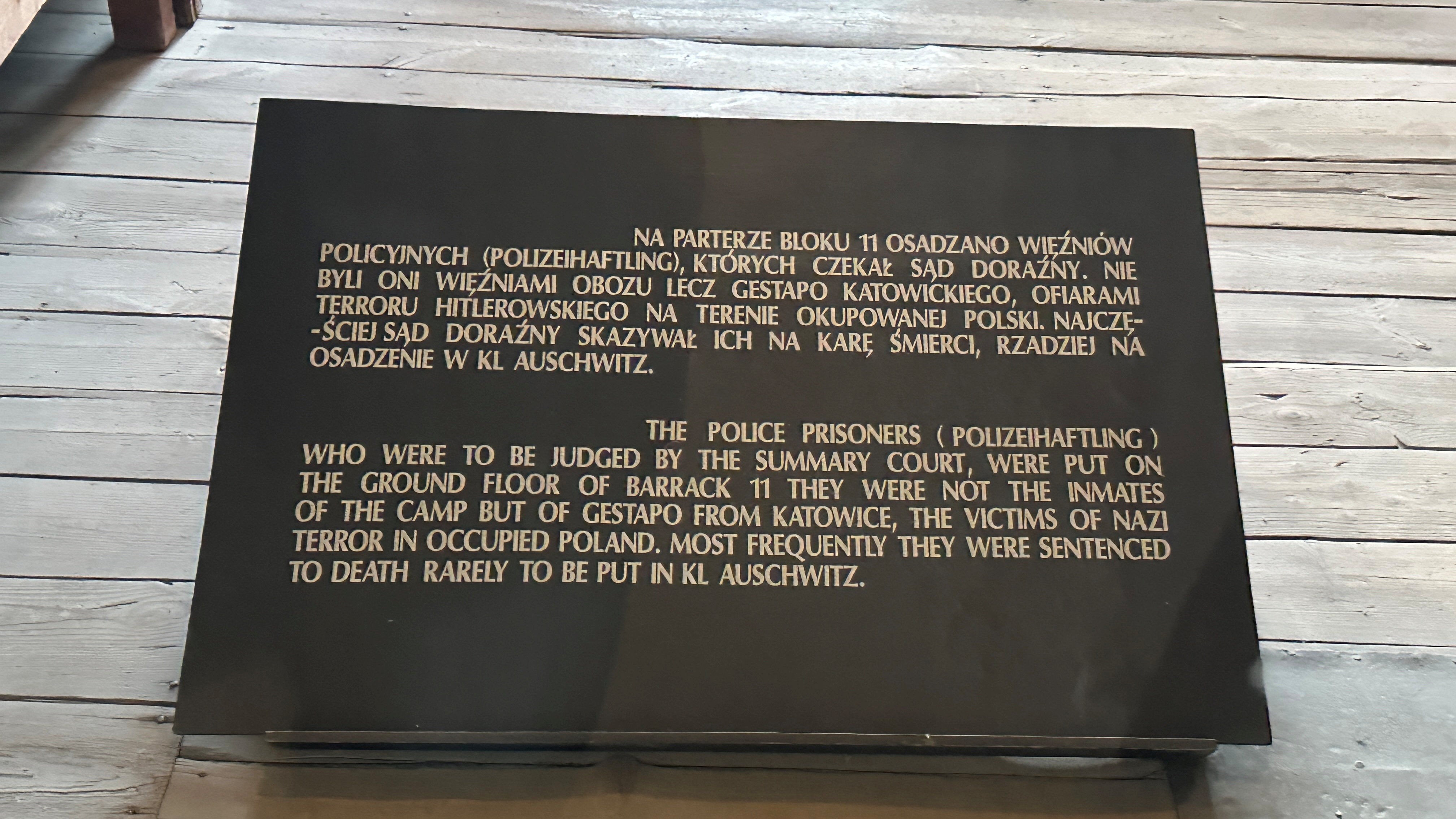 直訳です。 「ブロック 11 の 1 階には、警察囚人が収監され、簡易裁判所での裁判を待っていました。彼らは収容所の囚人ではなく、占領下のポーランドにおけるナチスの地上テロの犠牲者であるカトヴィツェのゲシュタポの囚人でした。簡易裁判所は彼らに死刑を宣告しましたが、占領下のポーランドではその頻度は低かったです。ほとんどの場合、彼らはアウシュビッツ強制収容所に収監されました。」 |