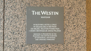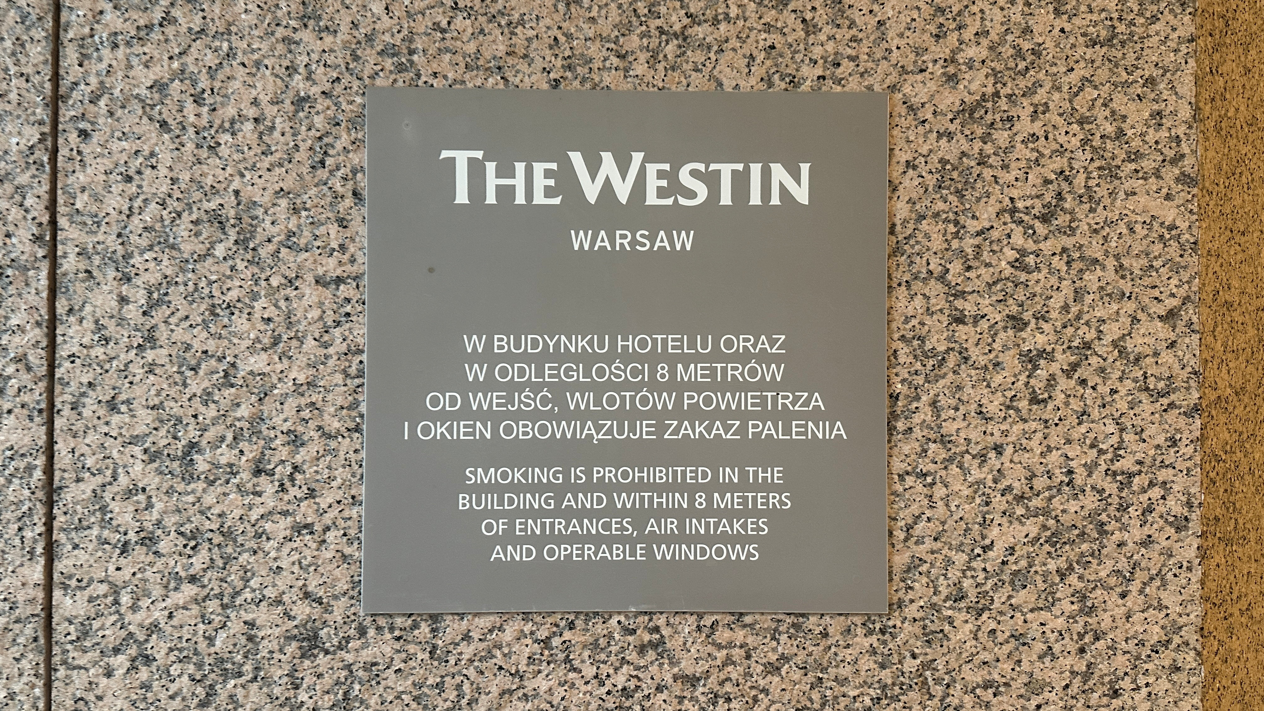 「ウェスティン・ワルシャワ ホテル館内および入口、吸気口、開閉可能な窓から8メートル以内は禁煙です。」