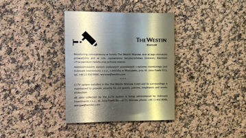 「ウェスティン・ワルシャワ ウェスティン・ワルシャワホテルおよびその周辺に設置されているCCTVシステムは、お客様、顧客、ホテル従業員の安全確保と財産保護を目的としています。