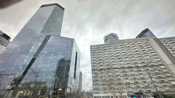 | ホテルの片側ある企業オフィスが入ったビルだ。左側が「デロイト」。55階建てでポーランドで壱班高いビルだそうだ。右側のビルも高いが、倍以上の高さがある。 |