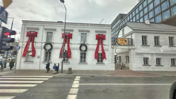 ワルシャワの商業複合施設「ファブリカ・ノルブリナ(ノーブリン工場)」の建物で、クリスマスシーズンなので赤いリボンやリースが飾られているという。 |