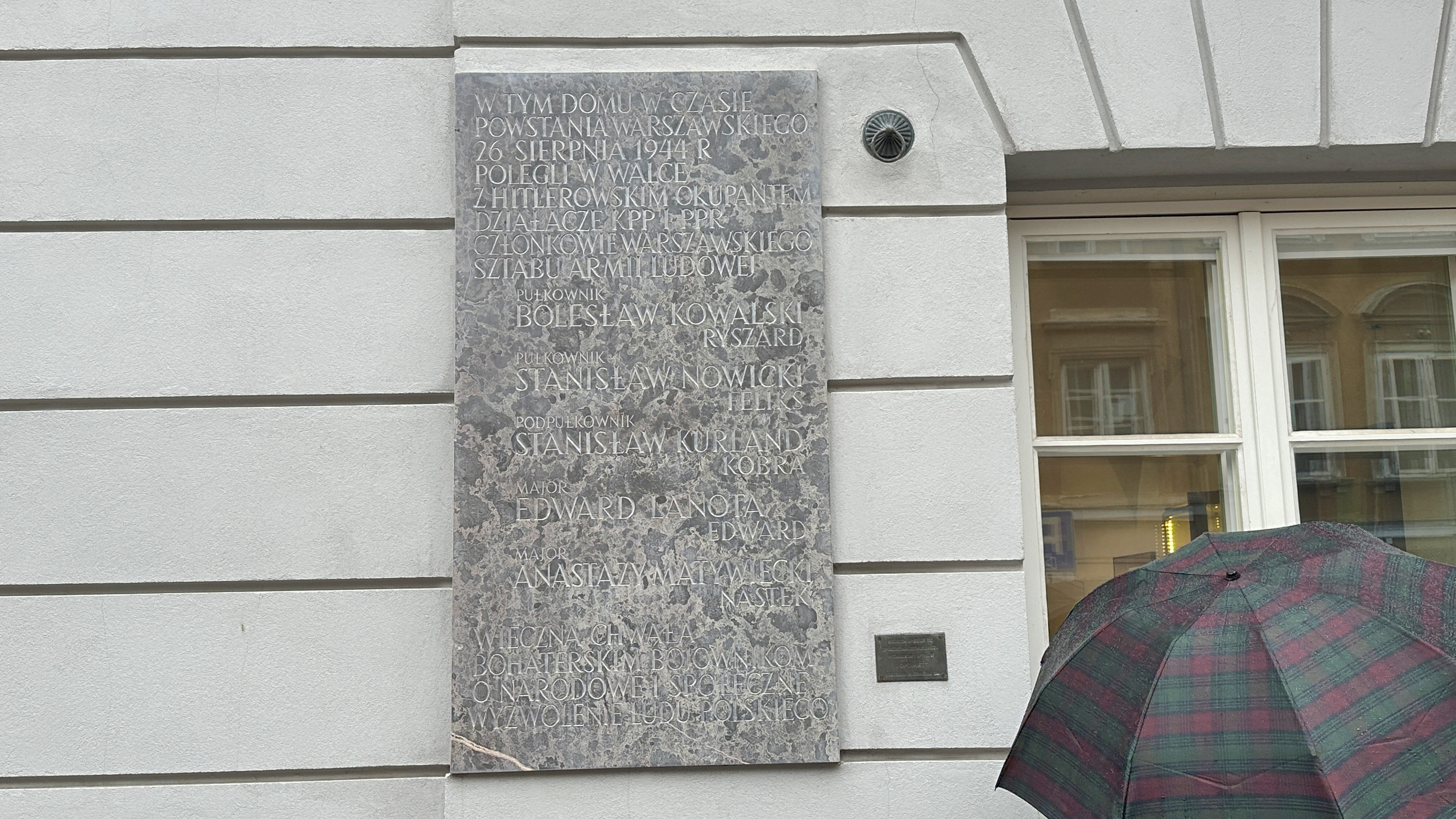 「1944年8月26日のワルシャワ蜂起中のこの家には、KPPPPの活動家、ワルシャワ職員、アーミル・ルドウェル、ボレスワ・コワルスキー、コヴシク、リザルデ、スタニスワフ・ノヴィツキ、スタニスワ・クルラン、エドワード・ラノ、アスタジマル、ヒトラーの占領との戦いに倒れた。」 |