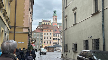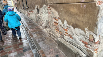 さて、広場の北西にあるボンスキ・ドゥナイ通りに行く。この壁は煉瓦の上にモルタルを塗ったものなのかな。そうでした、ここはビール通りの突き当りにある通りね。 |