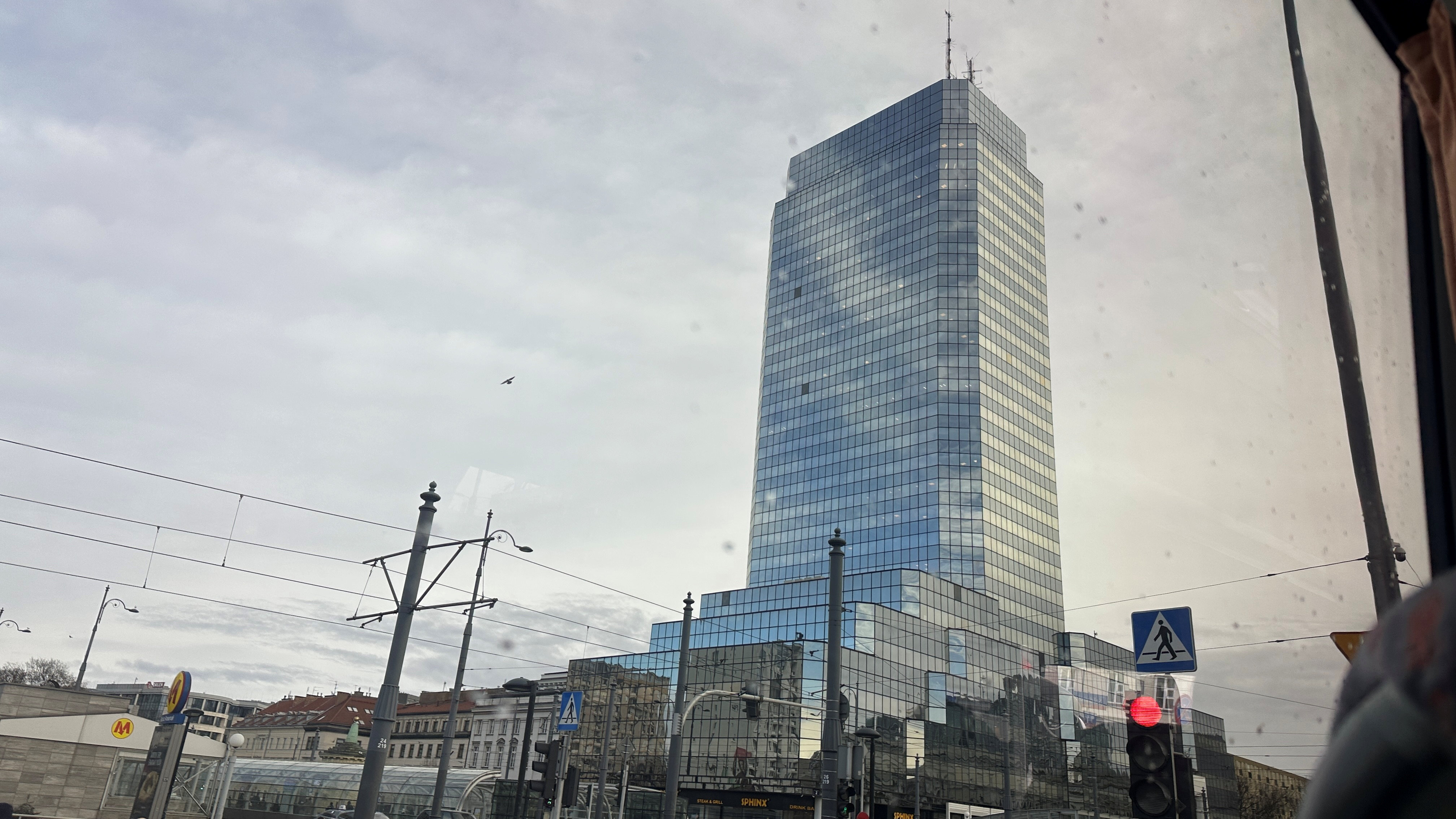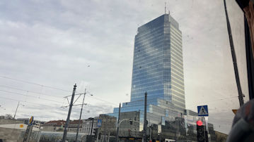 | 「ステファン・スタジンスキ記念碑」の前に立つ長身のビル「ブルータワー」。27階建てである。 |