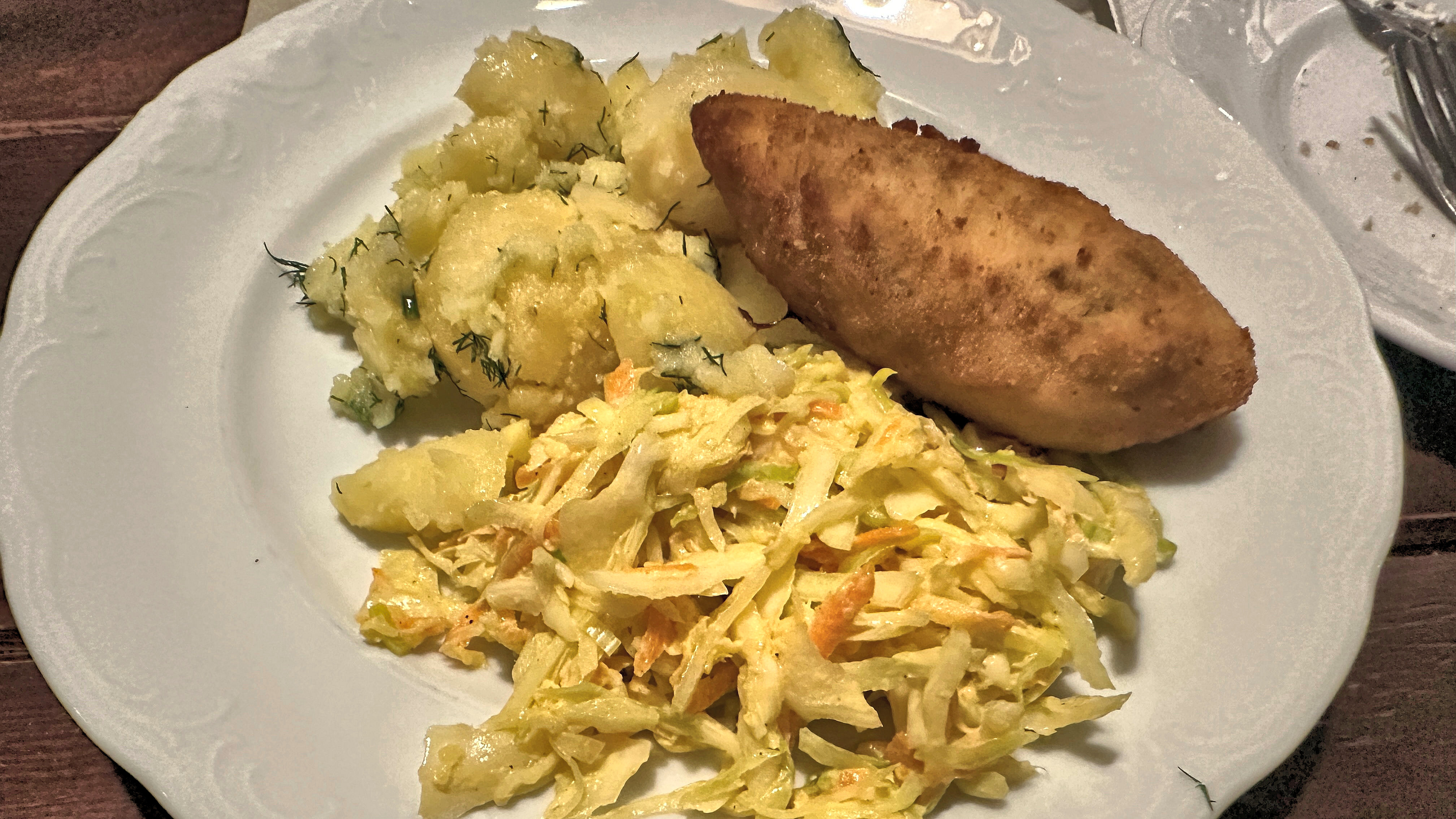 チキンカツレツの一種であるデボライ(Kotlet de volaille)と付け合わせに茹でたジャガイモと、コールスロー)。
